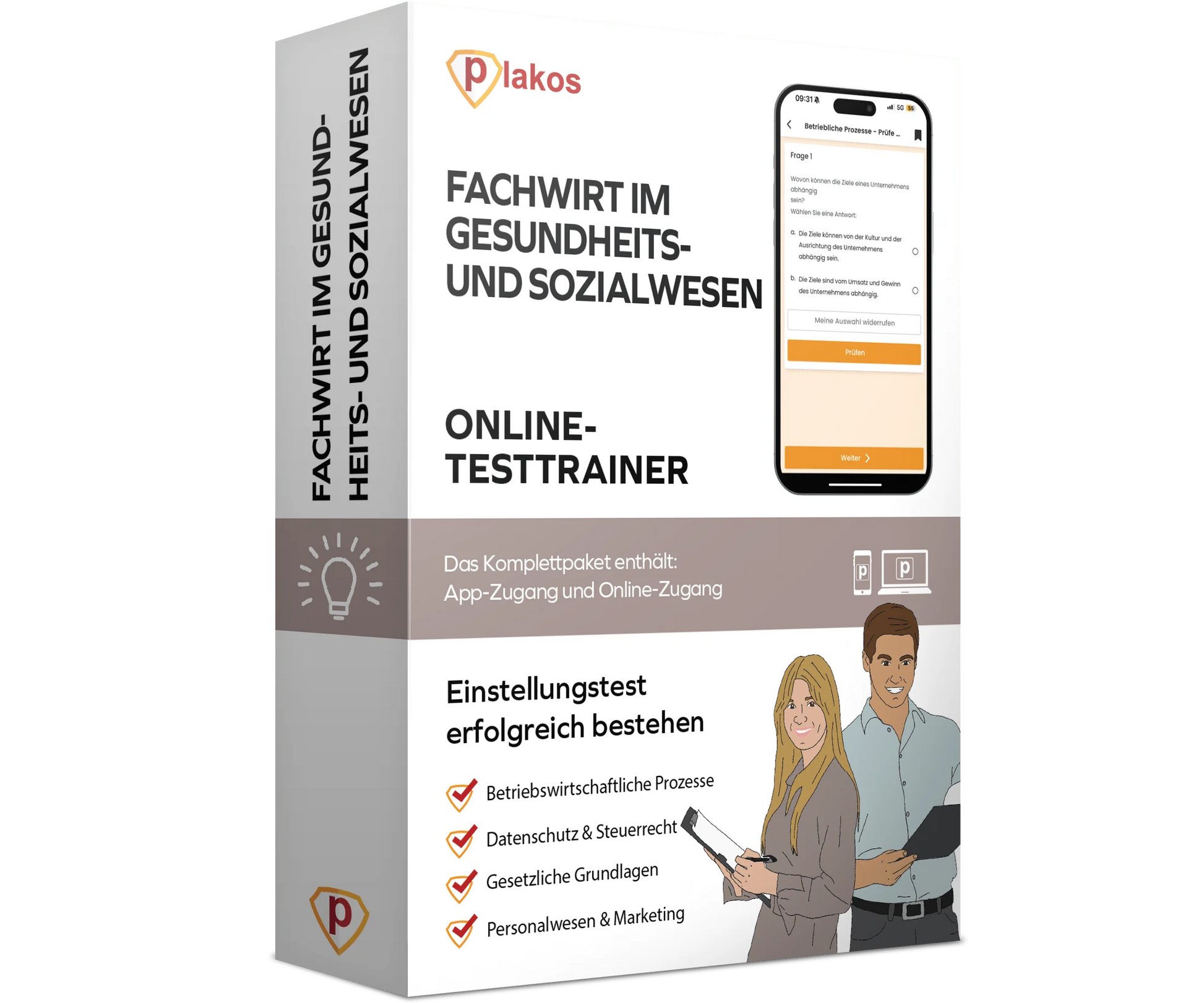 Unser Testtrainer enthält nicht nur zahlreiche Übungsaufgaben und interaktive Tests mit Lösungen, sondern auch nützliche Erklärvideos und Insidertipps. Zusätzlich erhältst du einen Zugang zu unserer App, mit welcher du bequem und effizient von unterwegs aus für deine Prüfungsfragen Fachwirt im Gesundheits- und Sozialwesen lernen kannst.