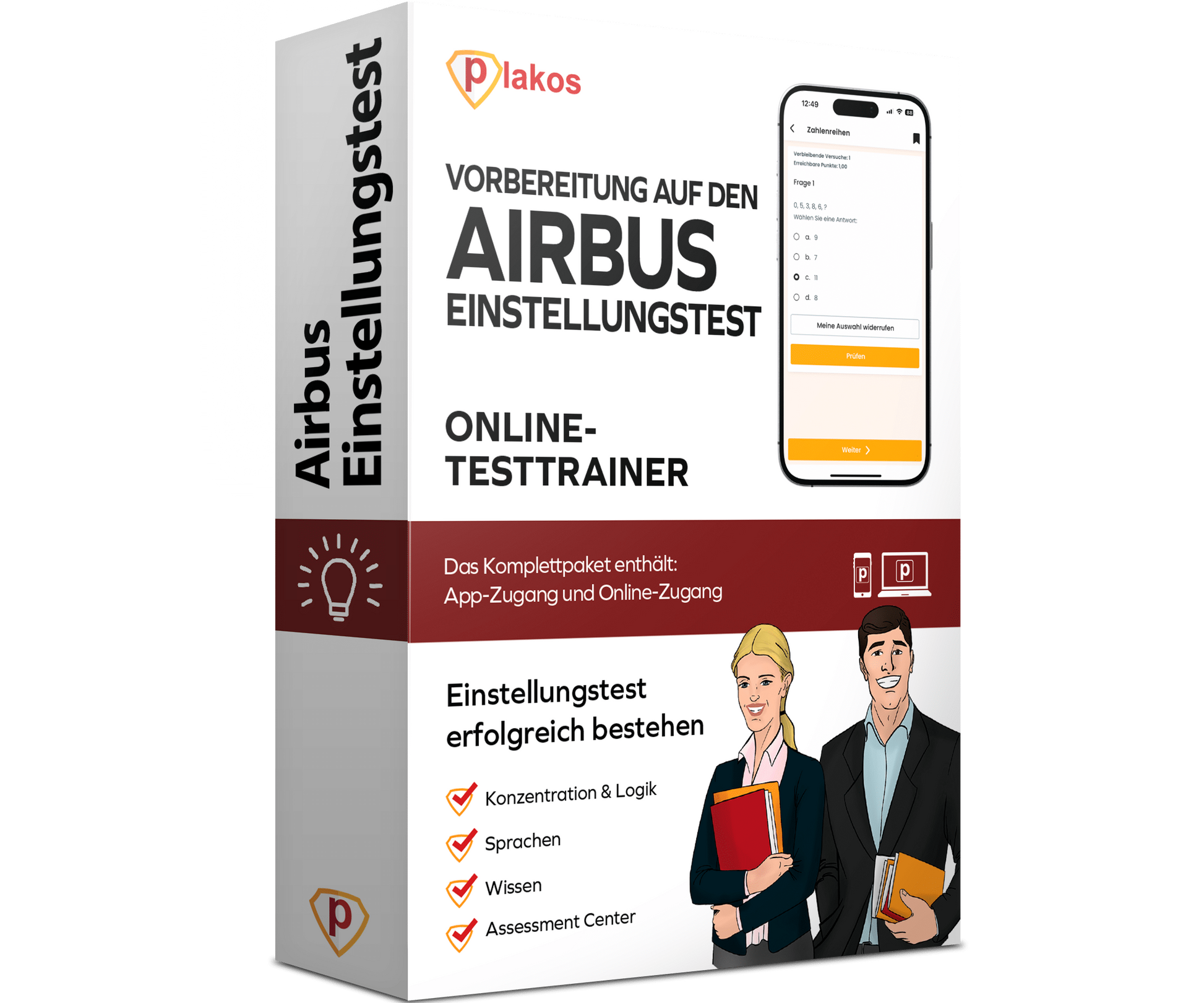 Das Online-Testtrainer Komplettpaket von Plakos bietet Dir die perfekte Vorbereitung auf den Airbus Einstellungstest und hilft Dir Deine Nervosität zu besiegen. Lerne verschiedene Aufgabentypen bereits im Voraus kennen und gehe mit einem sicheren Gefühl in Deinen Test!